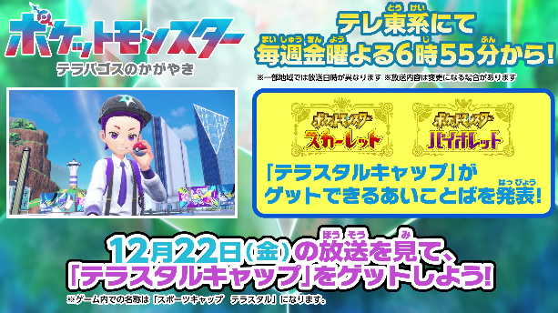 2023年12月22日(金)放送のアニメ「ポケットモンスター」内にて特別なアイテム「テラスタルキャップ」が配布されます。